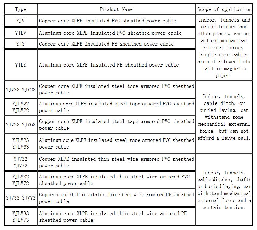 Note:For flame-retardant power cable, “Z(ZA-、ZB-、ZC-)” is added before the above type number;anti-termite power cable, "FY-" is added before the abovetype number;intelligent on-line temperature monitoring cable, "DFTS-"is added before the above type number.